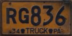 For 1934, and continuing to the present, truck plates bore a legend that clearly identified them as such. The legend was yy#Truck#Pa in 1934, and # yy Truck Pa # from 1935 to 1937, with the # symbol indicating the position of embossed keystones, and the "yy" indicating the two-digit issue year. Serial formats reverted to patterns similar to those used in 1931, with a split alpha format. Again, the first letter was always R through Z excluding X, but this time the first letter was always in position 1. Although 1937 passenger car plates were issued with a state map outline, truck plates continued in the plain style for one additional year.