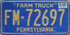These blue-on-yellow plates were introduced about half a year after the corresponding Keystone State passenger car plates, and were issued starting in October 1977 to about early 1984 or so. It's entirely possible that apportioned and farm truck plates continued to be issued on this base beyond 1984. All of these could then be renewed through 2000 expiration dates. The state name was stamped at the top, between sticker wells located in the upper corners. Once again, several types of truck plates were issued; the specific plate type was stamped at the bottom of the plate.