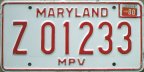 Standard base MPV platesMaryland introduced the multi-purpose passenger vehicle plate type on the red-on-white base in January 1979. I remember encountering my first MPV plate on a snowy day at my university campus. Prior to this time, passenger vans, SUVs, motor homes, and private buses such as church buses were issued regular passenger car plates, and at least some three-wheeled vehicles were issued motorcycle plates. The only serial format on this base was Z 00000, and the embossed legend MPV adorned the bottom center of the plates. On the red-on-white base, serials never got beyond the lower numbers of the Z series. Early MPV plates issued in January and February 1979 were issued with 1979 stickers, which expired at the end of March 1979. Plate number Z 01233, shown at left, has a blue 1979 sticker under the red 1980 sticker. The vast majority of red-on-white MPV plates, however, had natural 1980 stickers which expired at the end of March 1980. In March 1980, the painted black-on-white base replaced the red-on-white base, but had the same serial format and legend. Serial format was again Z 00000, but as mini-vans and small SUVs were introduced in the early- and mid-1980s, this class became increasingly popular and the Z series was exhausted. A new Y 00000 format was introduced fairly late in the life of the black-on-white base, but it had already reached the upper serial numbers when this base was discontinued in early 1986. |
