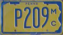 Municipal motorcycle plates were introduced in the mid-1970s and were colored yellow on navy , with Municipal at the top and Penna at the bottom, and serial format MG000. These were replaced in 1977 during the statewide general reissue.