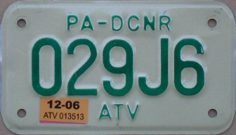 I debated whether to include all-terrain vehicle (ATV) plates on this page, since they don't resemble motorcycle plates and they're clearly marked as ATV plates. Obviously, I decided to go ahead and do so. ATVs are off-road vehicles, and these plates are issued by the state Department of Conservation and Natural Resources (DCNR). Despite that, ATV plates are easily recognizable as having been made at the same facility that makes license plates issued by the Department of Transportation.